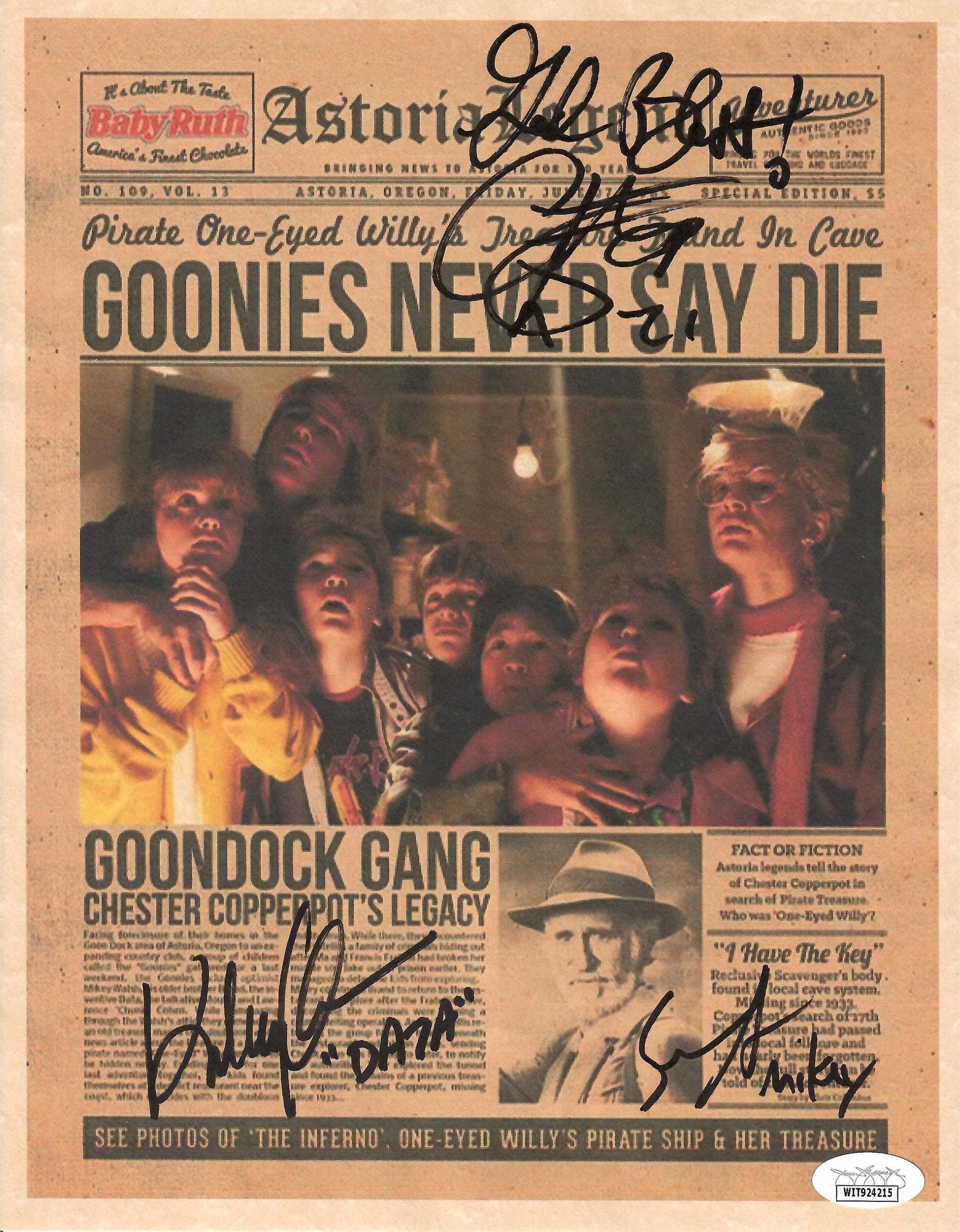 Corey Feldman Johnathan KeQuan Sean Astin signed inscribed Newsprint Goonies JSA
