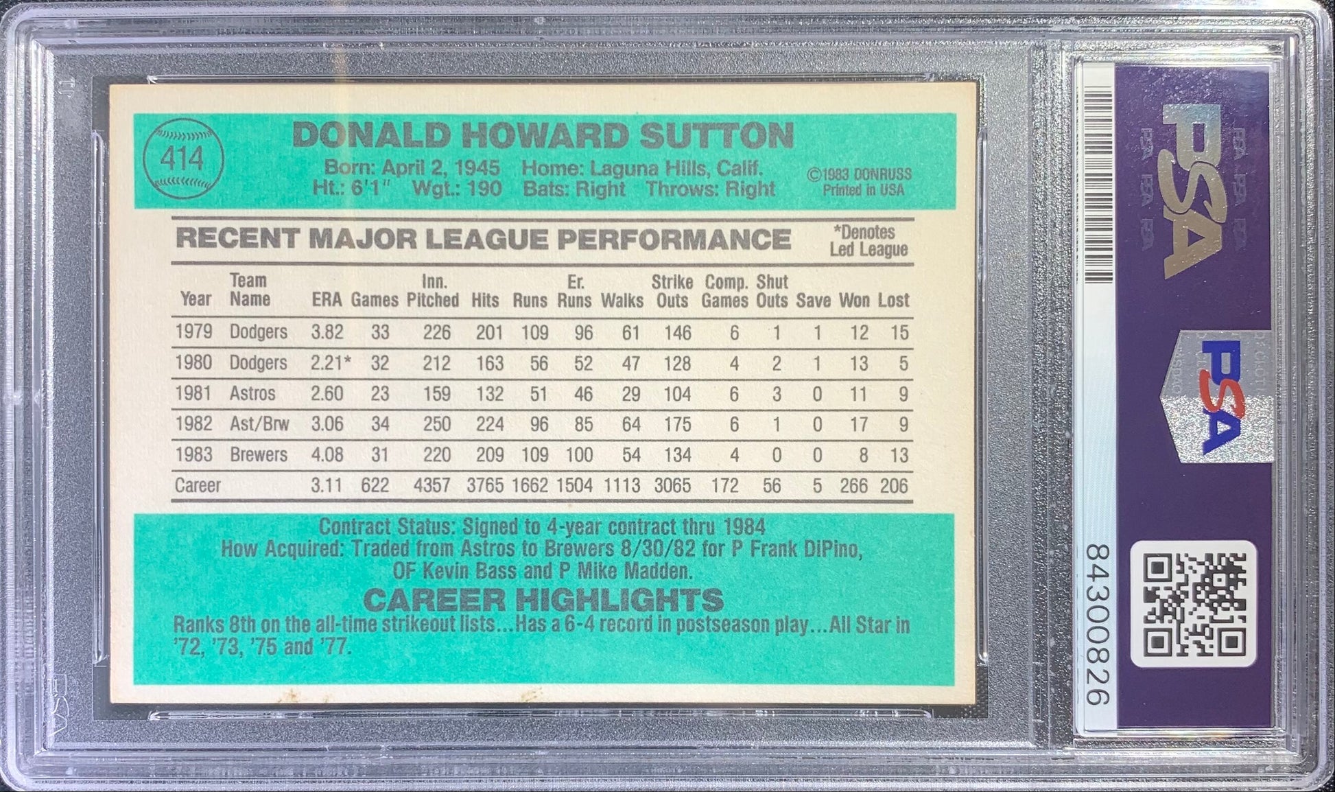 Don Sutton auto card 1984 Donruss #414 MLB Milwaukee Brewers PSA Encapsulated