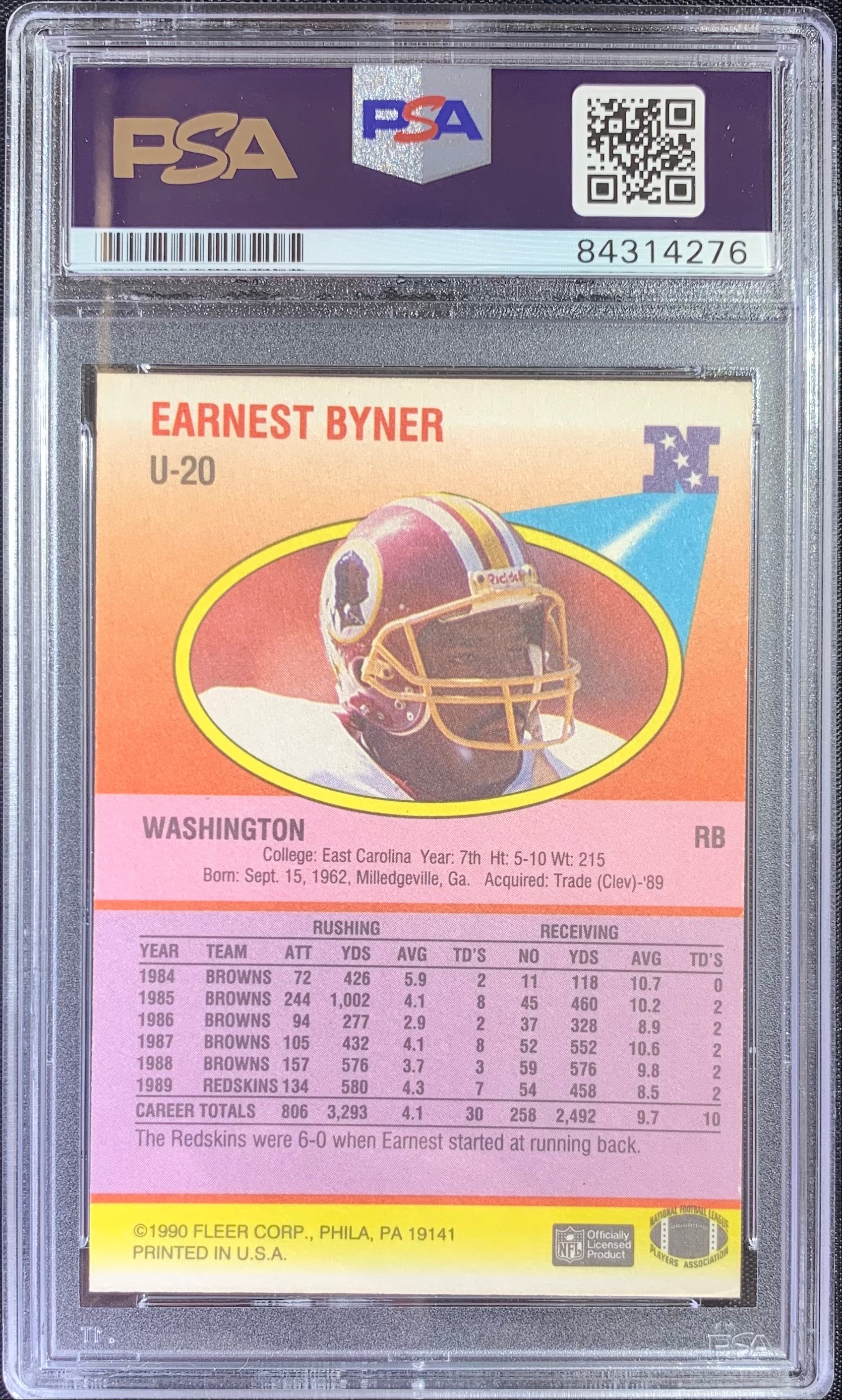Earnest Byner autographed signed 1990 Fleer card #U-20 Redskins PSA Encapsulated