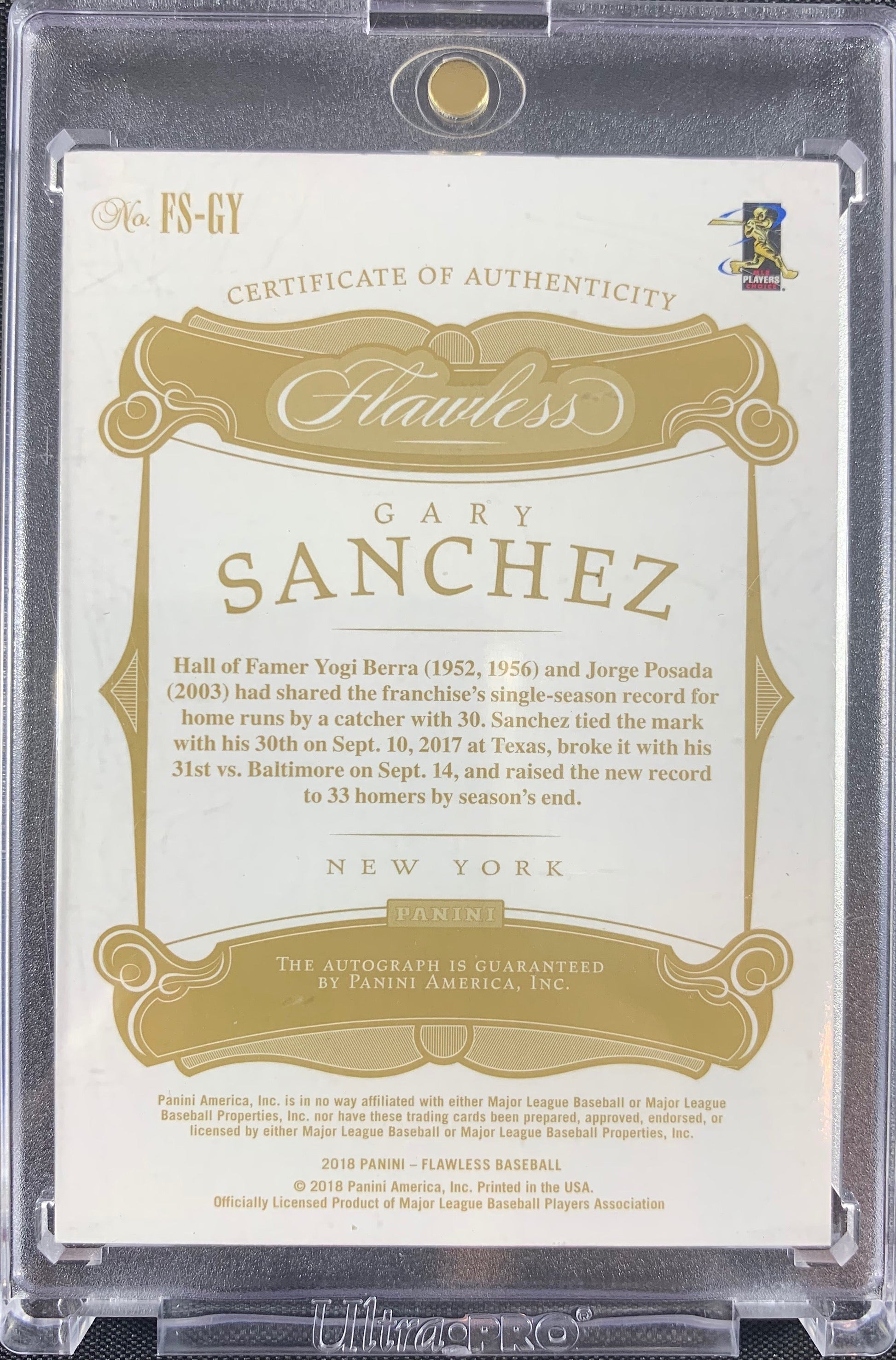 Gary Sanchez autographed signed Card 1/1 New York Yankees 2018 Panini Flawless