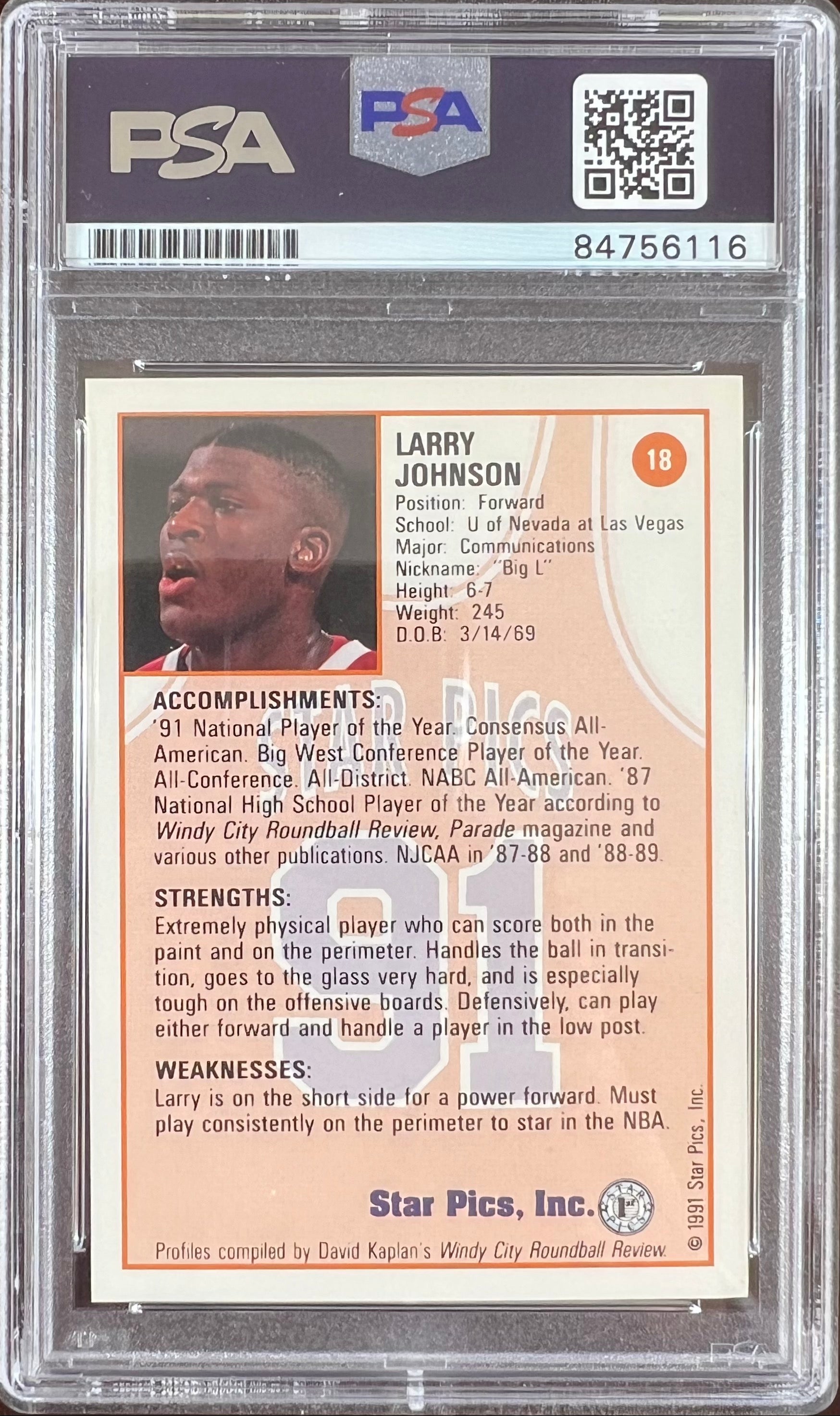 Larry Johnson auto 1991 Star Pics RC #18 UNLV PSA Encapsulated Charolett Hornets