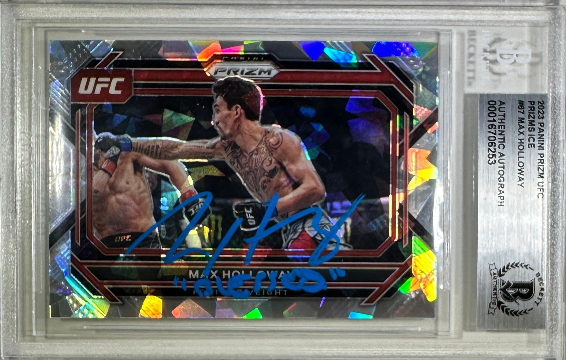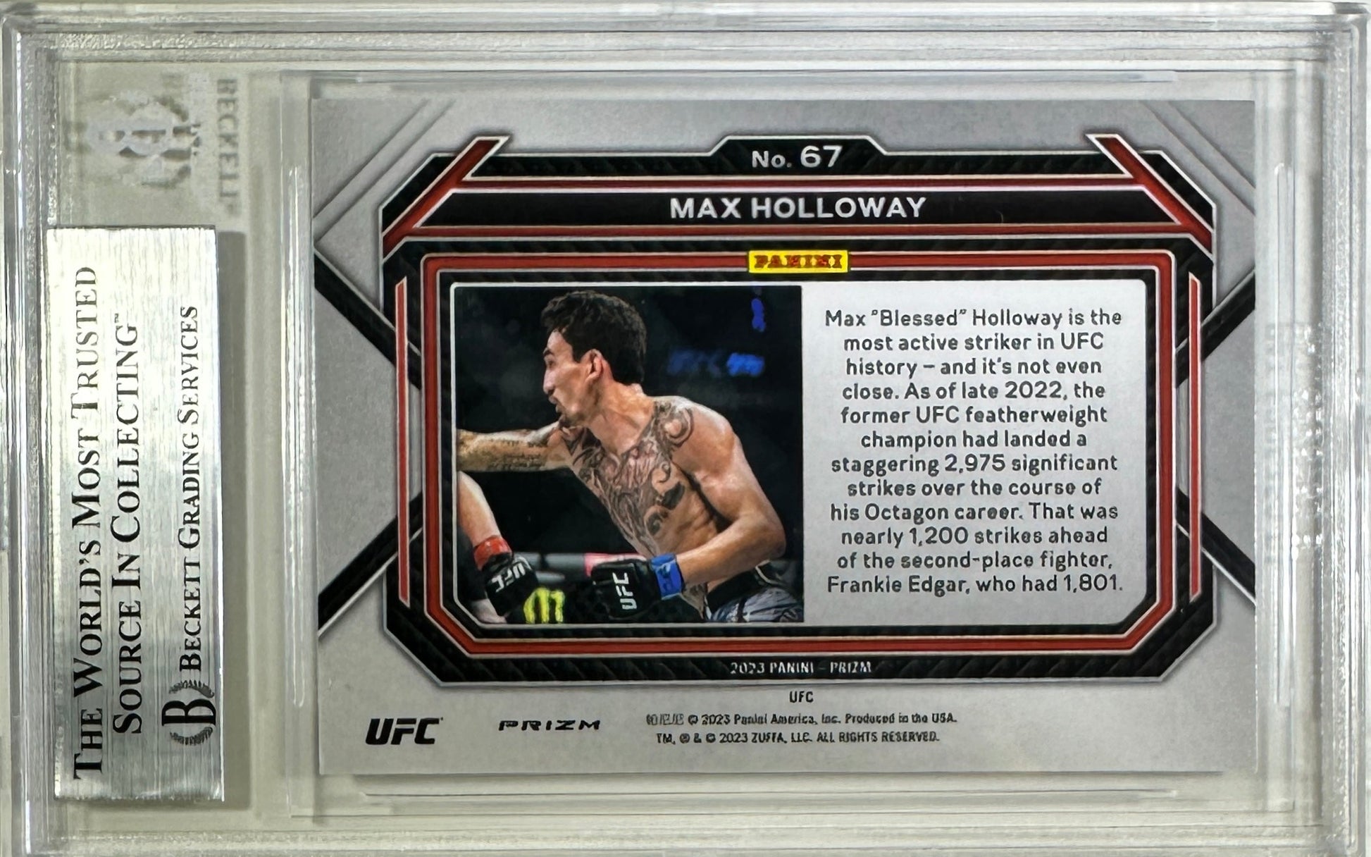 Max Holloway auto inscribed 2023 Panini Prizm card #67 UFC BAS Encapsulated