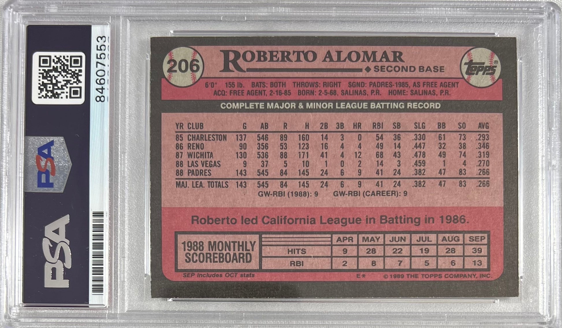 Roberto Alomar auto inscribed Topps RC MLB San Diego Padres PSA Encapsulated