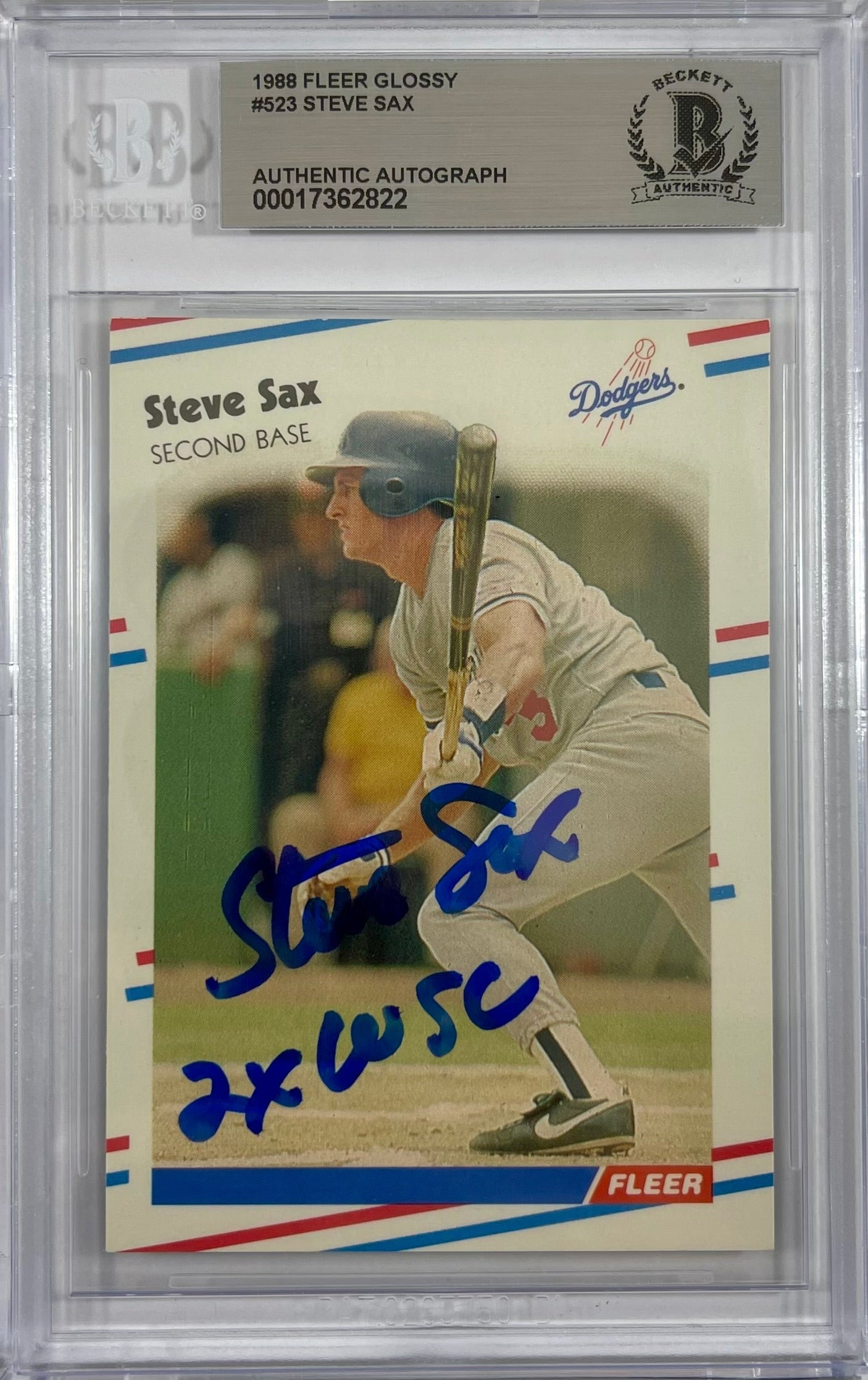 Steve Sax auto inscribed card 1988 Fleer #523 MLB New York Yankees BAS Encap