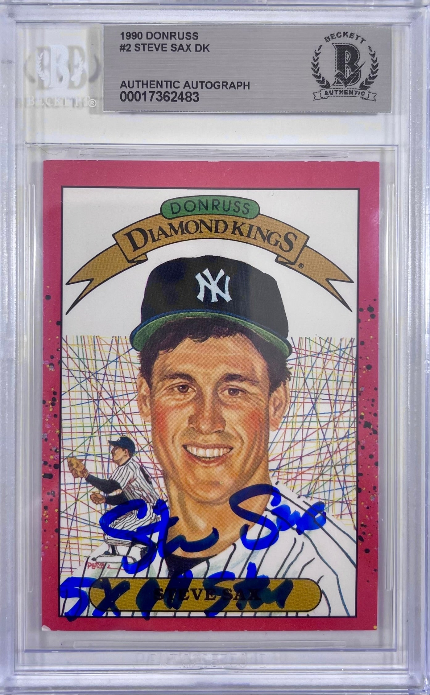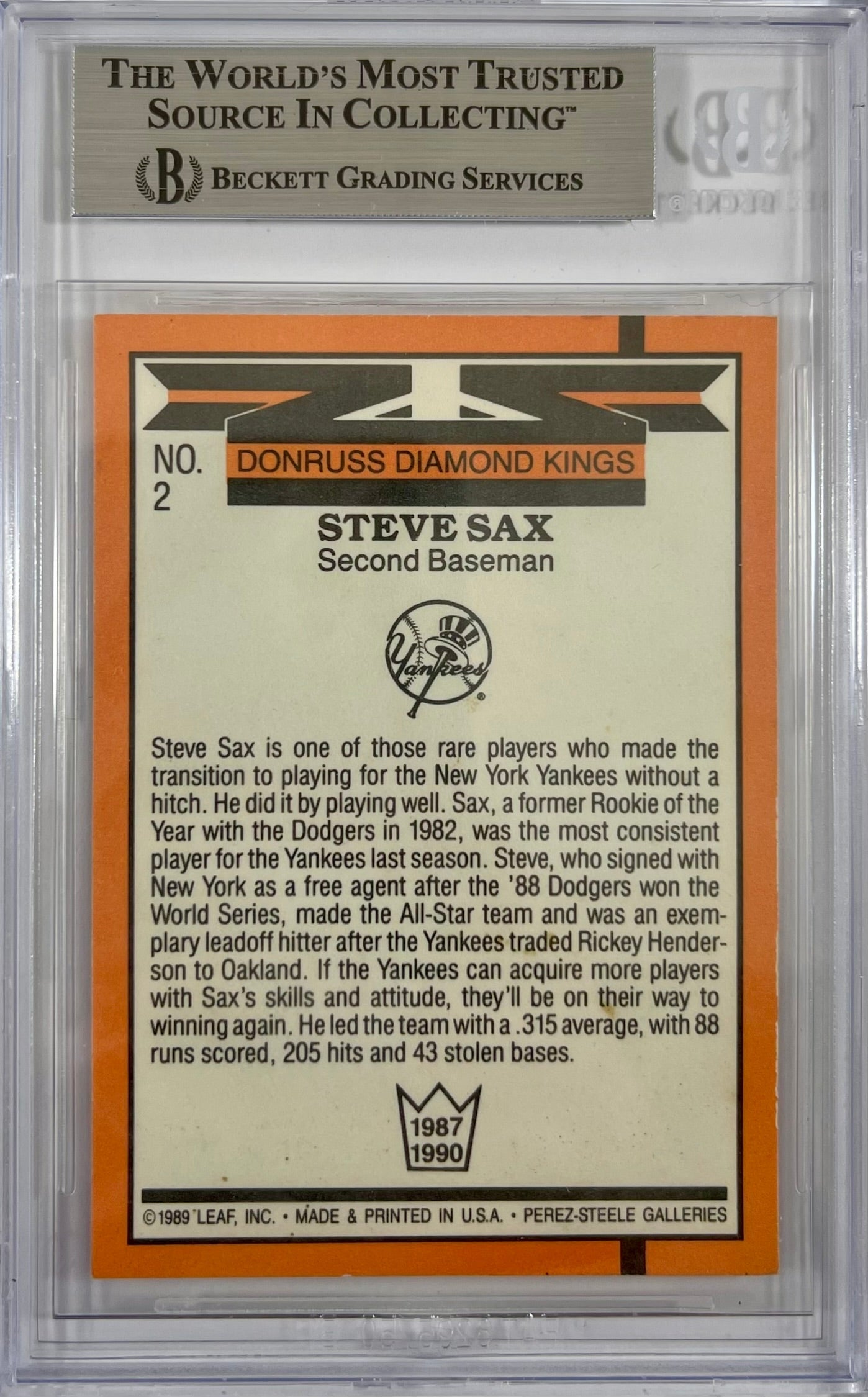 Steve Sax auto inscribed card 1989 Leaf #2 MLB New York Yankees BAS Encap